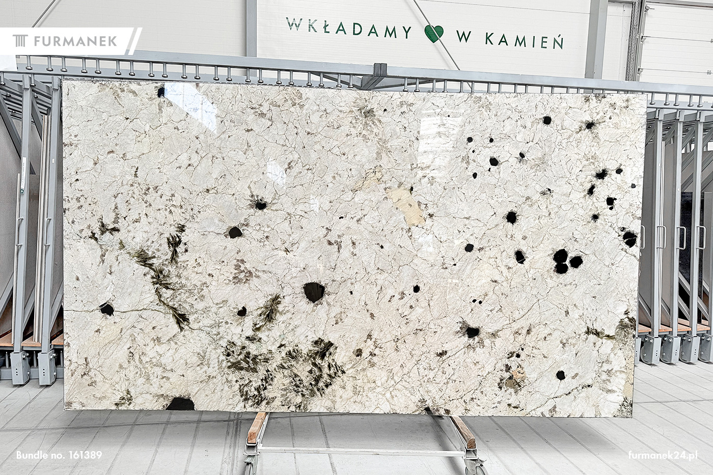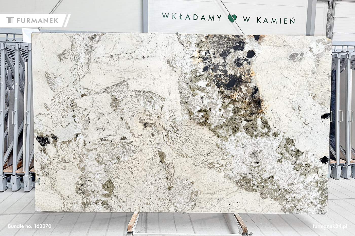 Alpinus White granite slabs. They come in the following surface variants: polished and satin-finished. Granite will find its use indoors as well as outdoors. Our slabs are additionally selected (sorted by shade and color). Granite Alpinus White is frost resistant. Ideally suited for underfloor heating. Our slabs meet the highest standards of thickness tolerance and surface finish. Application: wall cladding, window sill, facade, kitchen countertops, bathroom countertops, stairs, fireplace, floor.