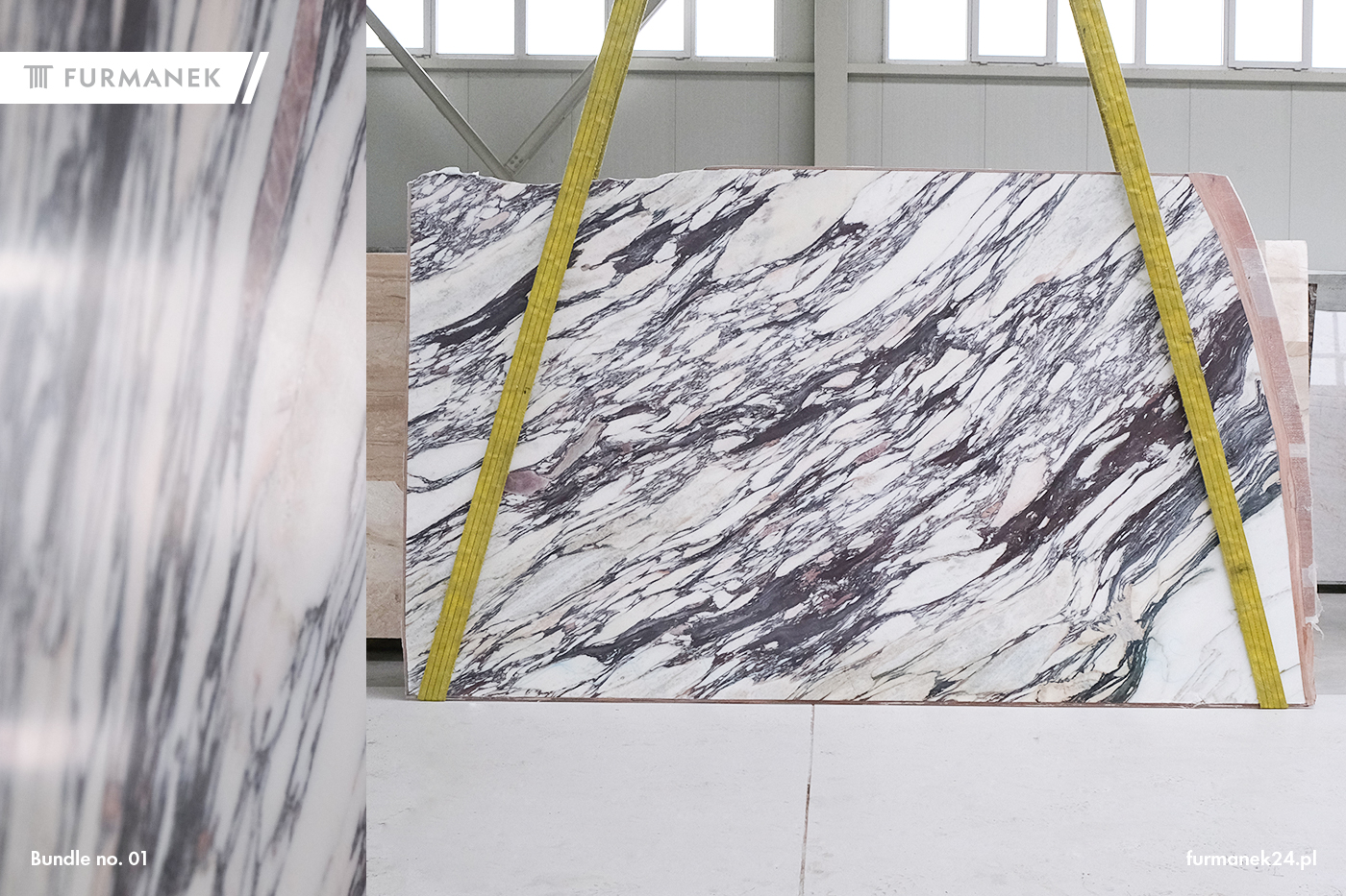 Calacatta Viola marble slabs. They come in the following surface variants: polished and honed. Our slabs meet the highest standards of thickness tolerance and surface finish. Our slabs are additionally selected (sorted by shade and color). Ideally suited for underfloor heating. Application: bathroom countertops, stairs, fireplace, wall cladding, window sill, floor, facade.