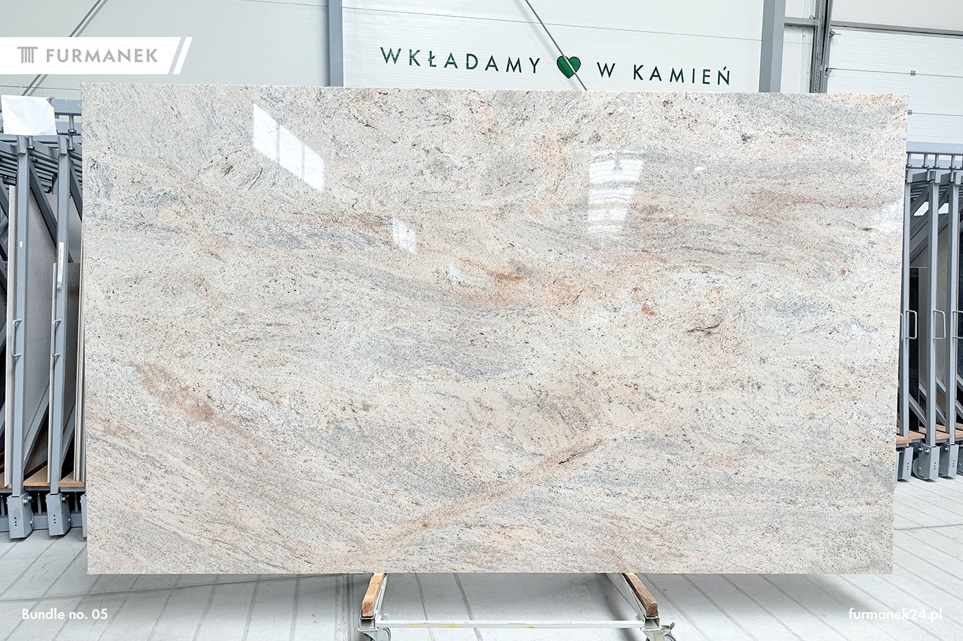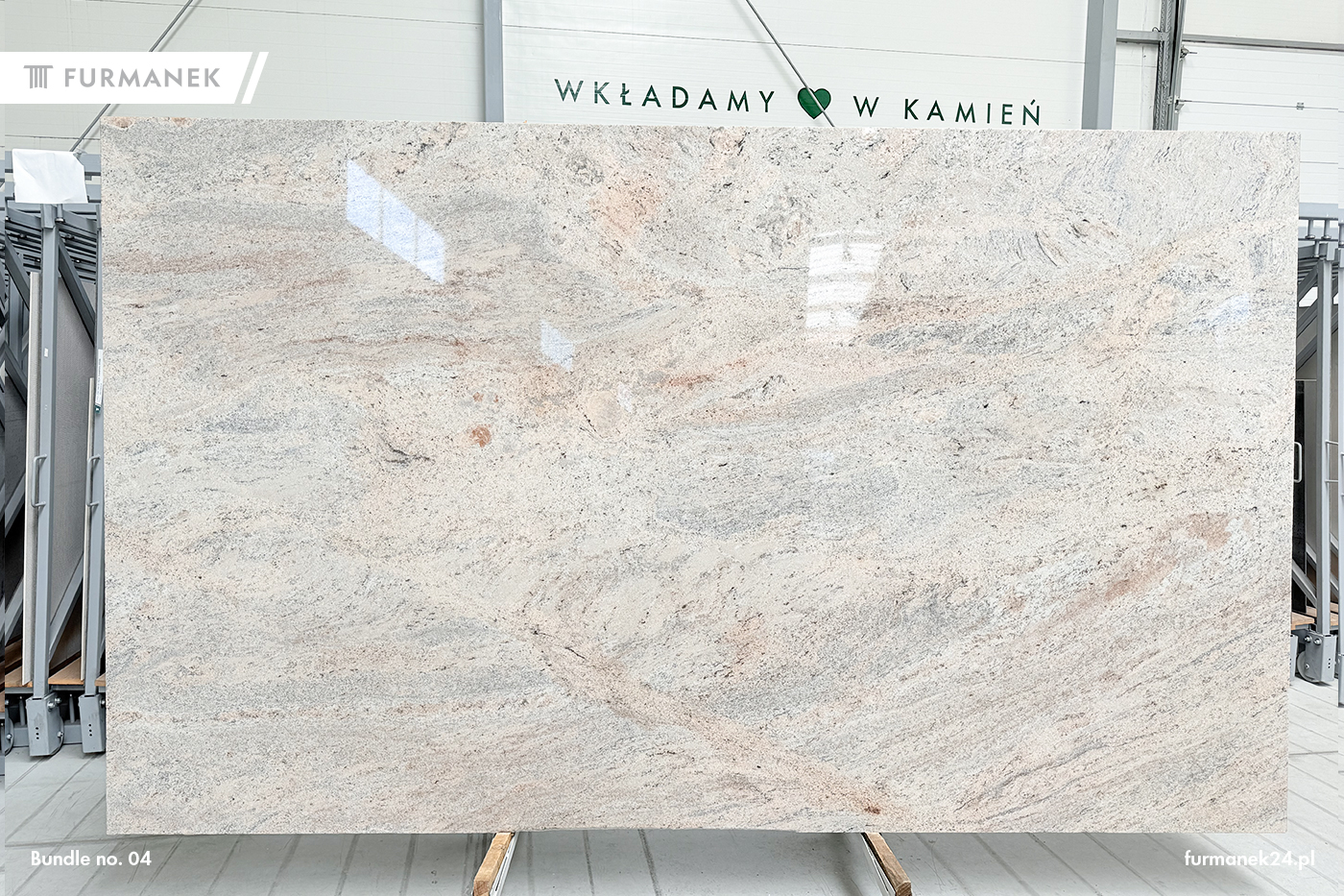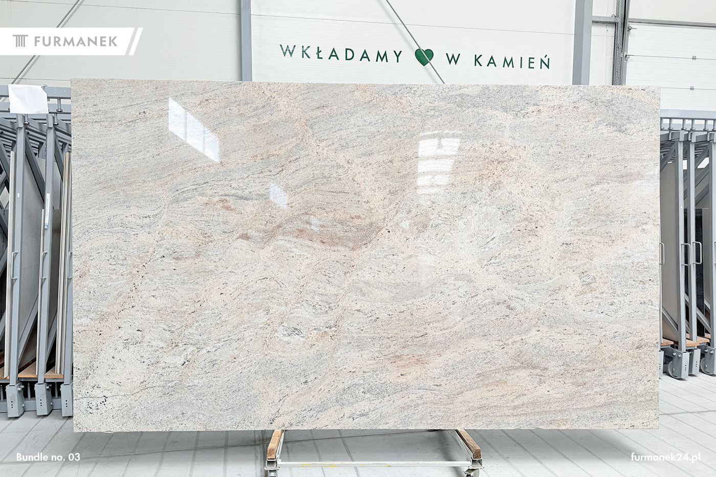 Colonial Ivory granite slabs. They come in the following surface variants: polished. Our slabs are additionally selected (sorted by shade and color). Granite Colonial Ivory is frost resistant. Ideally suited for underfloor heating. Our slabs meet the highest standards of thickness tolerance and surface finish. Granite will find its use indoors as well as outdoors. Application: wall cladding, window sill, facade, kitchen countertops, bathroom countertops, stairs, fireplace, floor.